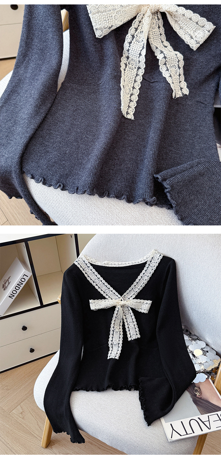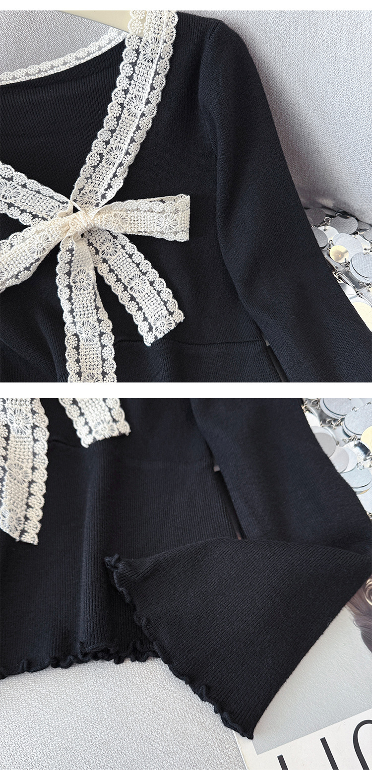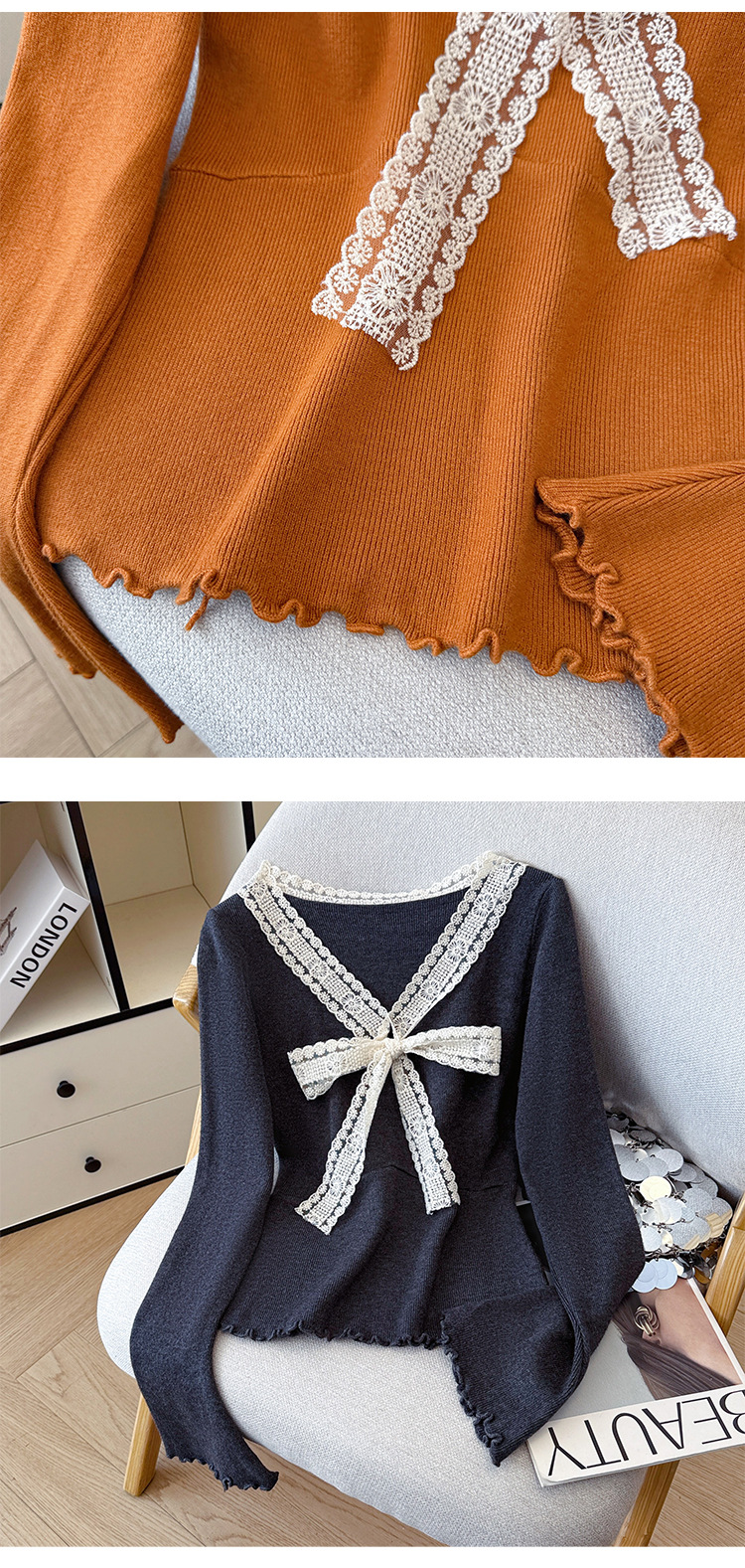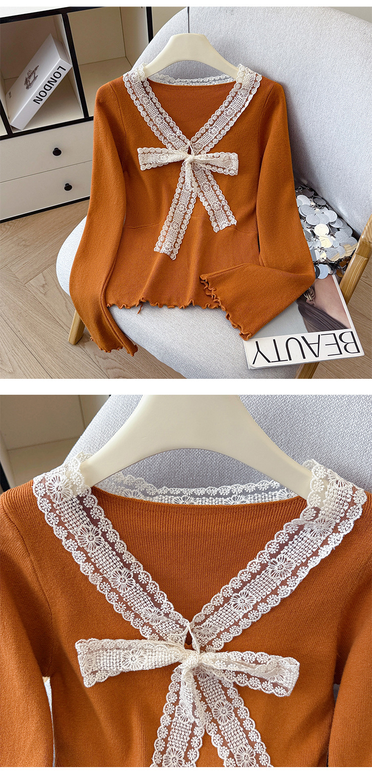 V-Neck Knit Sweater with Bow Detail - Flared Sleeve Pullover