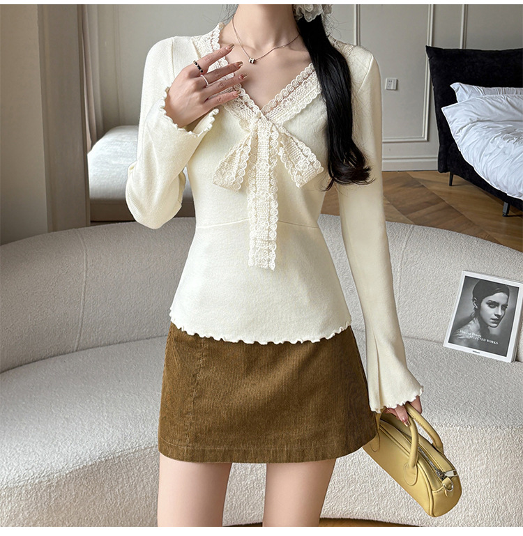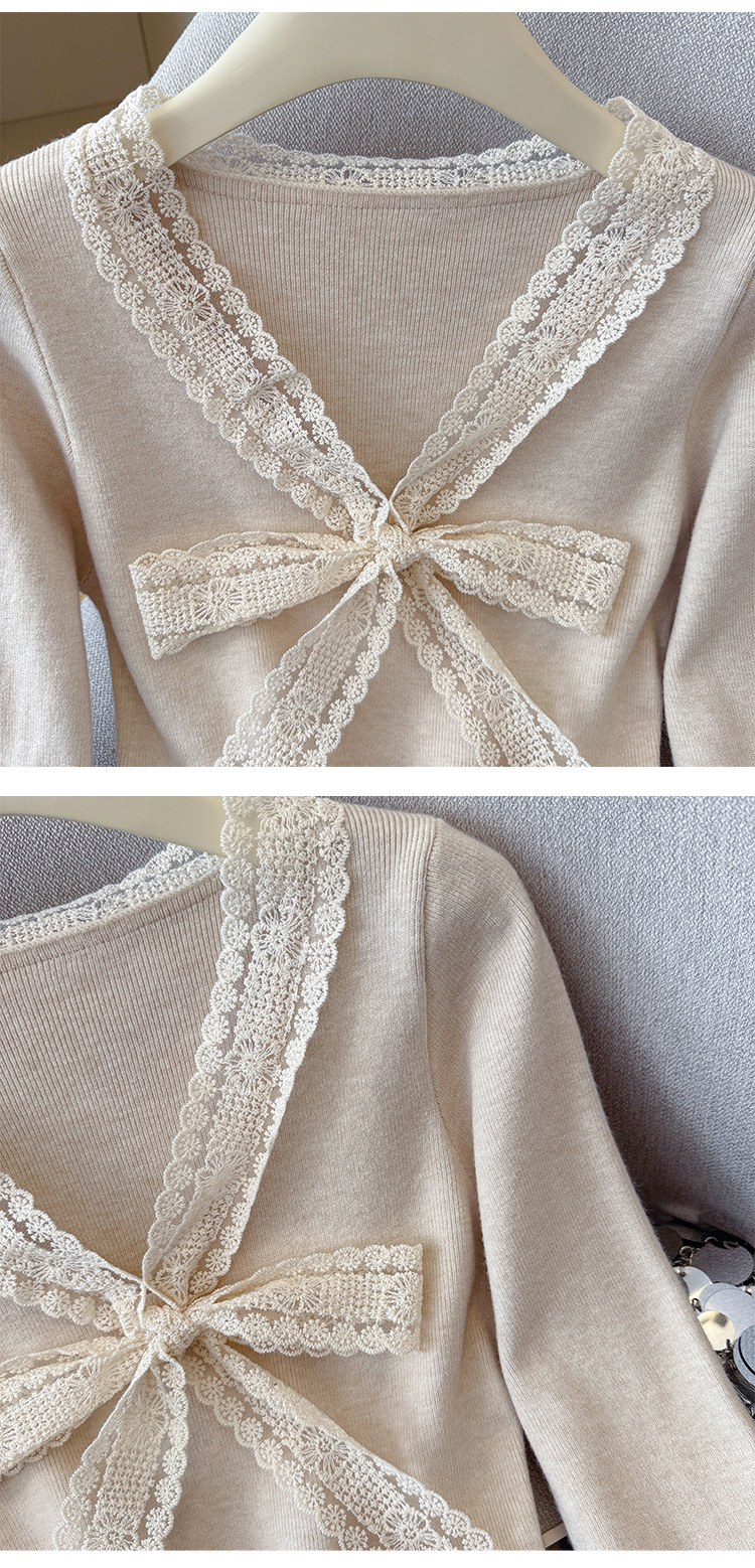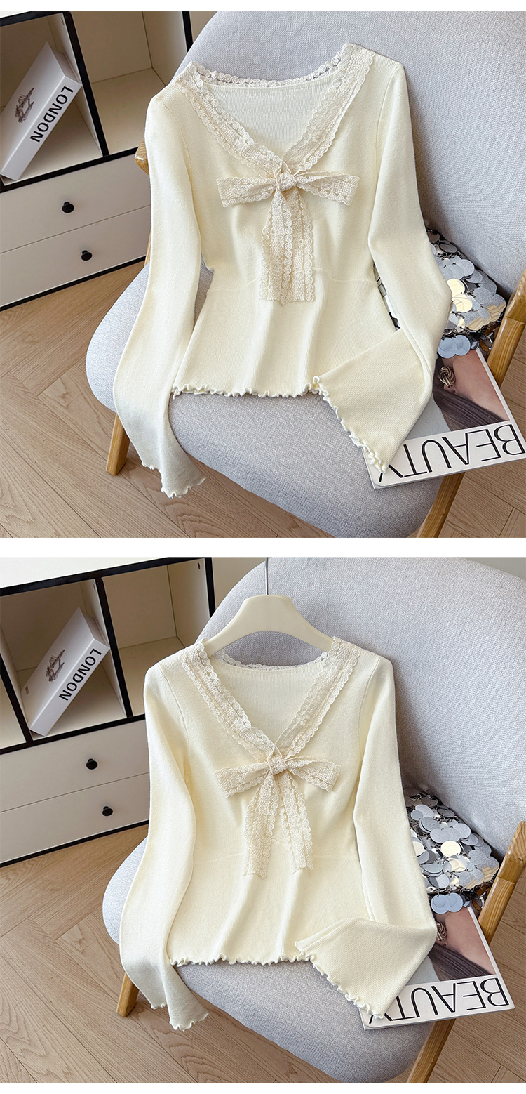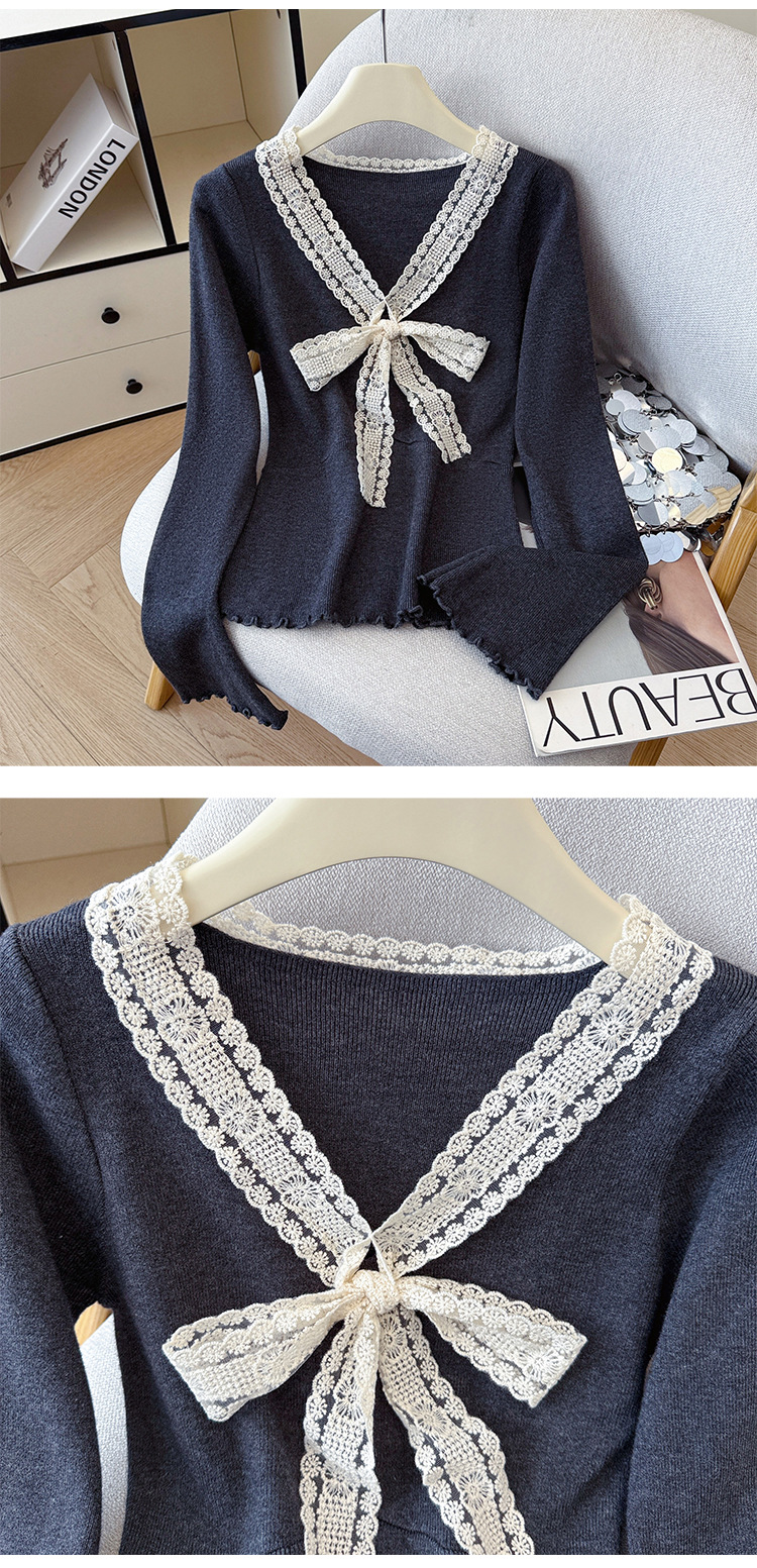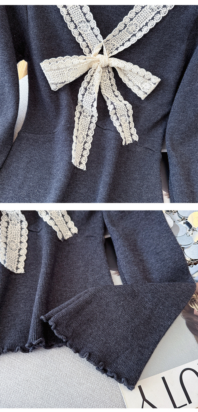 V-Neck Knit Sweater with Bow Detail - Flared Sleeve Pullover