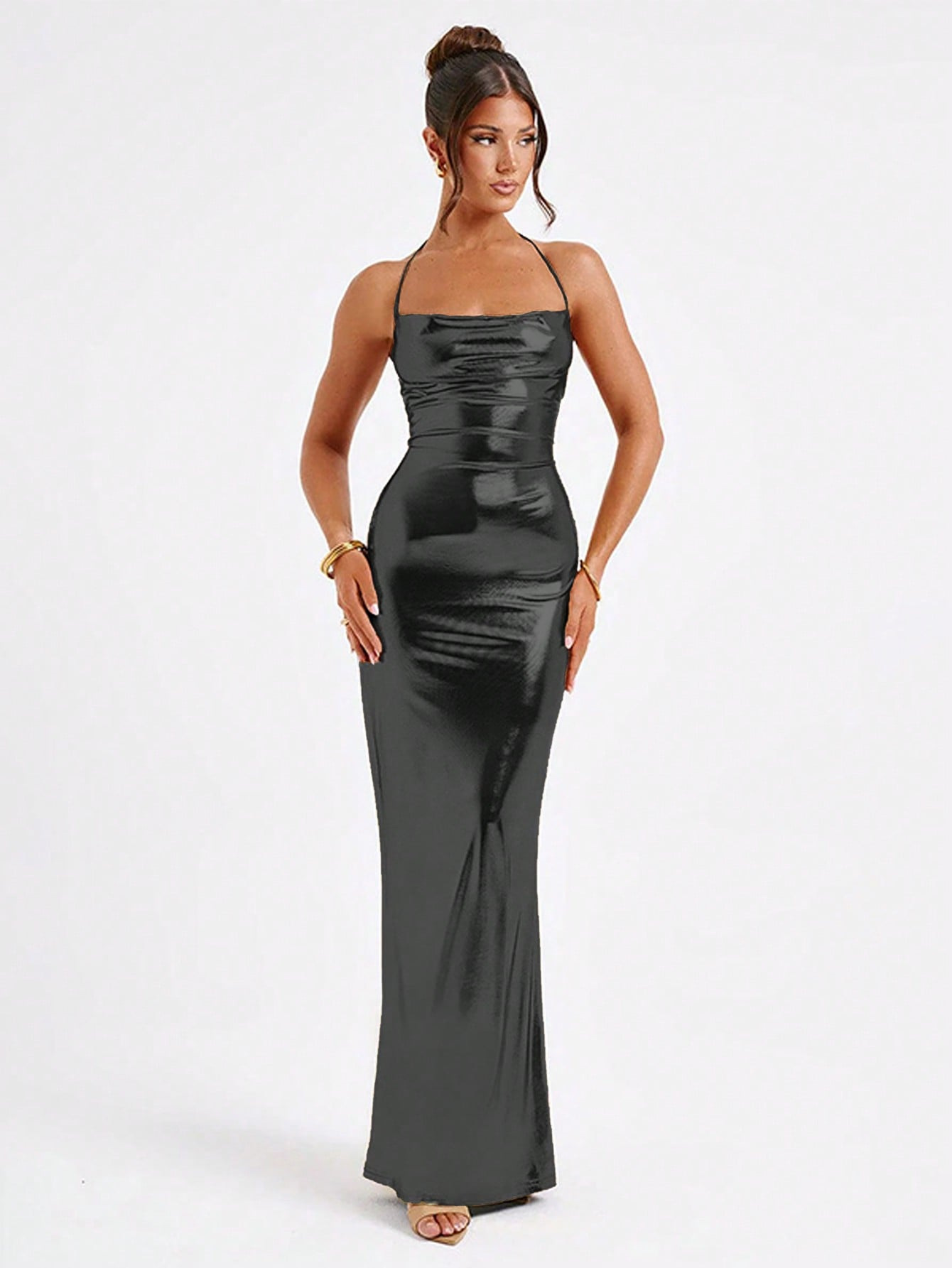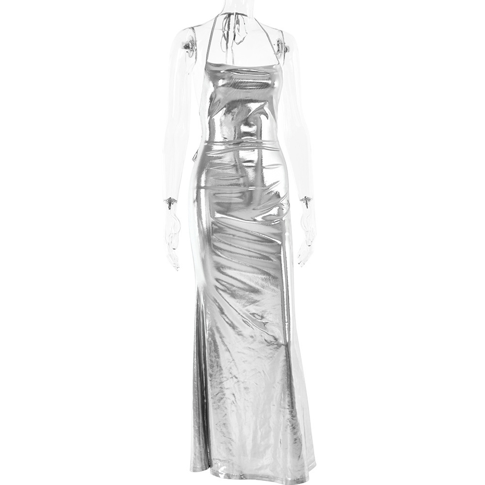 Elegant Solid Color Halter Neckline Chest Cutout Shiny Metallic Backless Dress