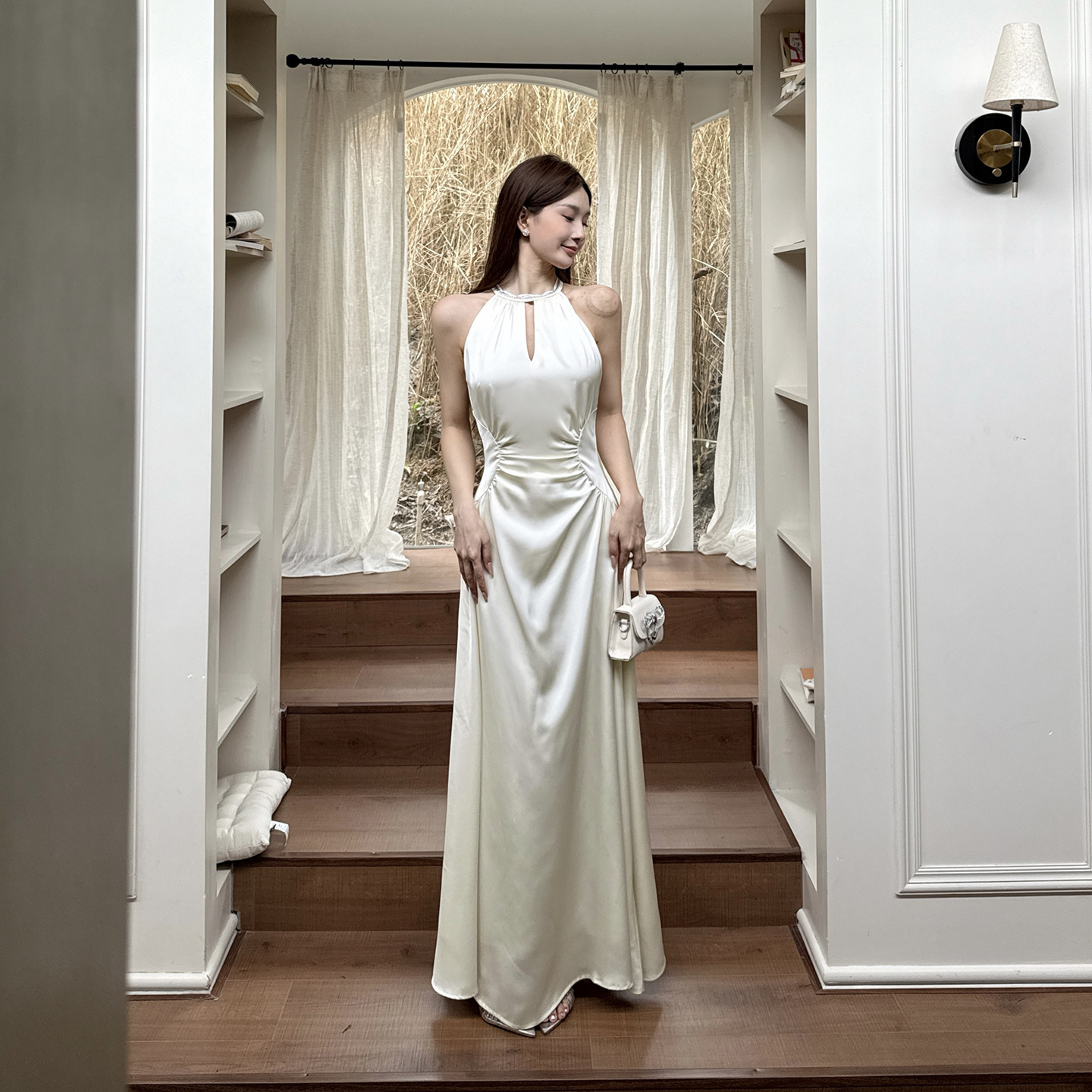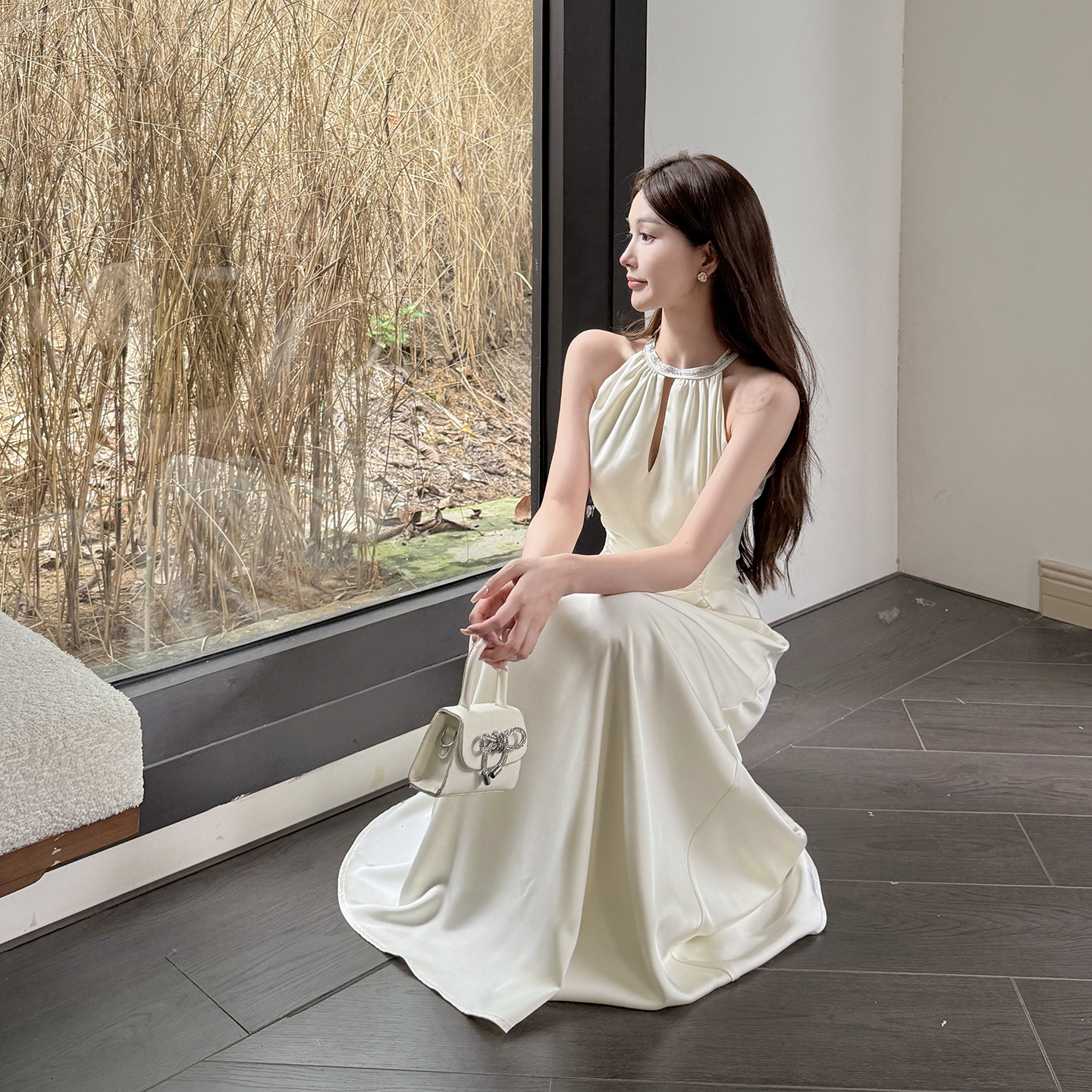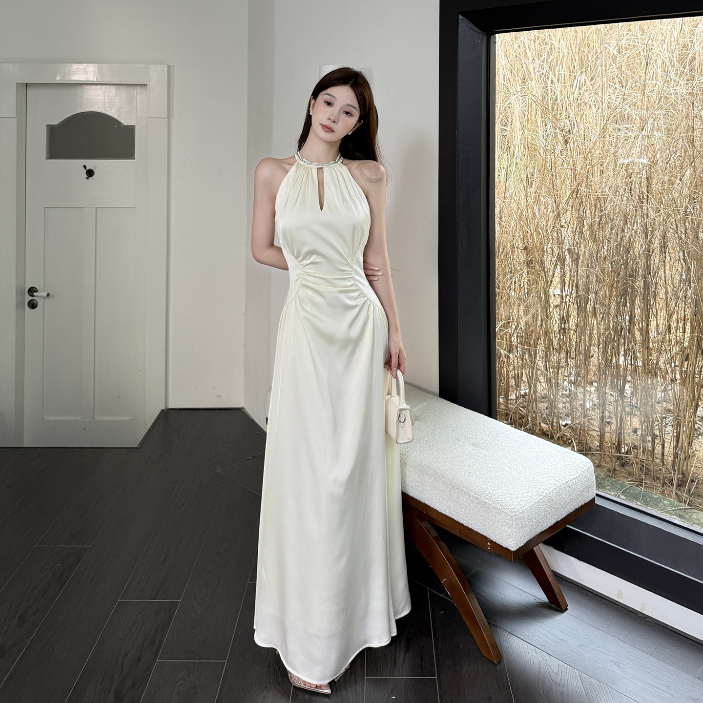 Hanging Neck Satin French Minimalist Elegant Long Skirt - Apricot Midi Dress
