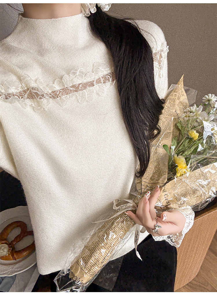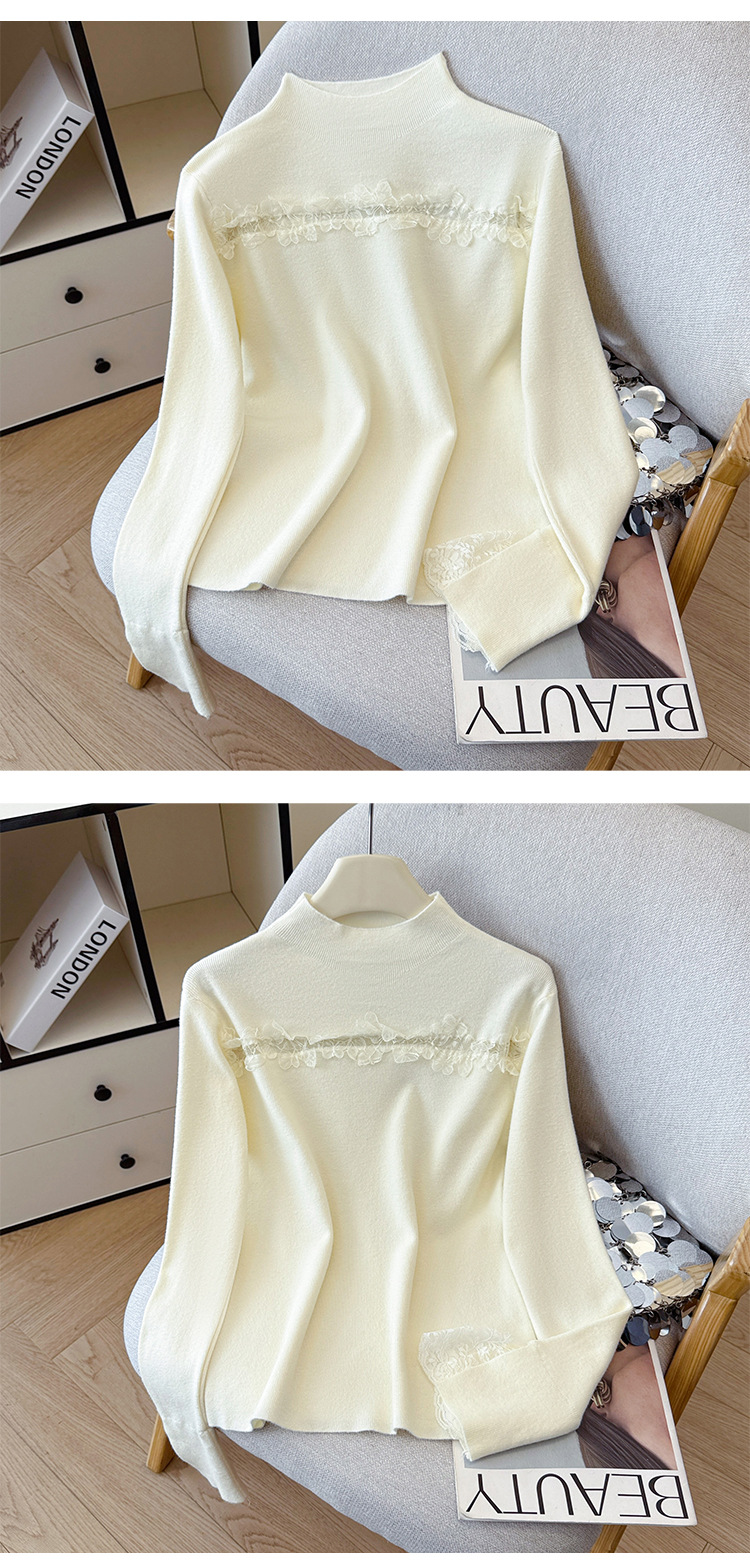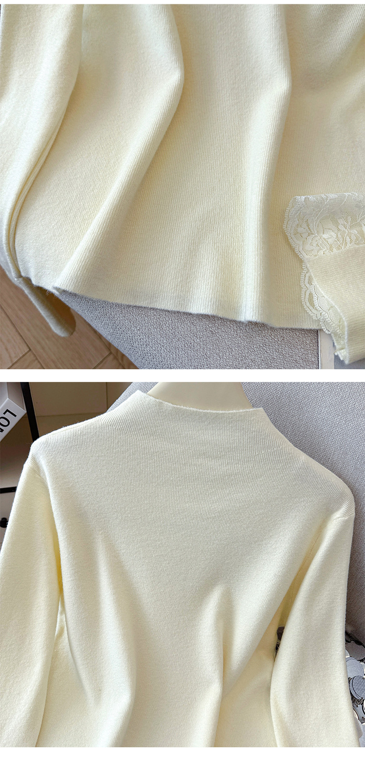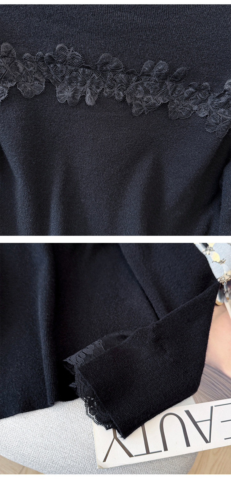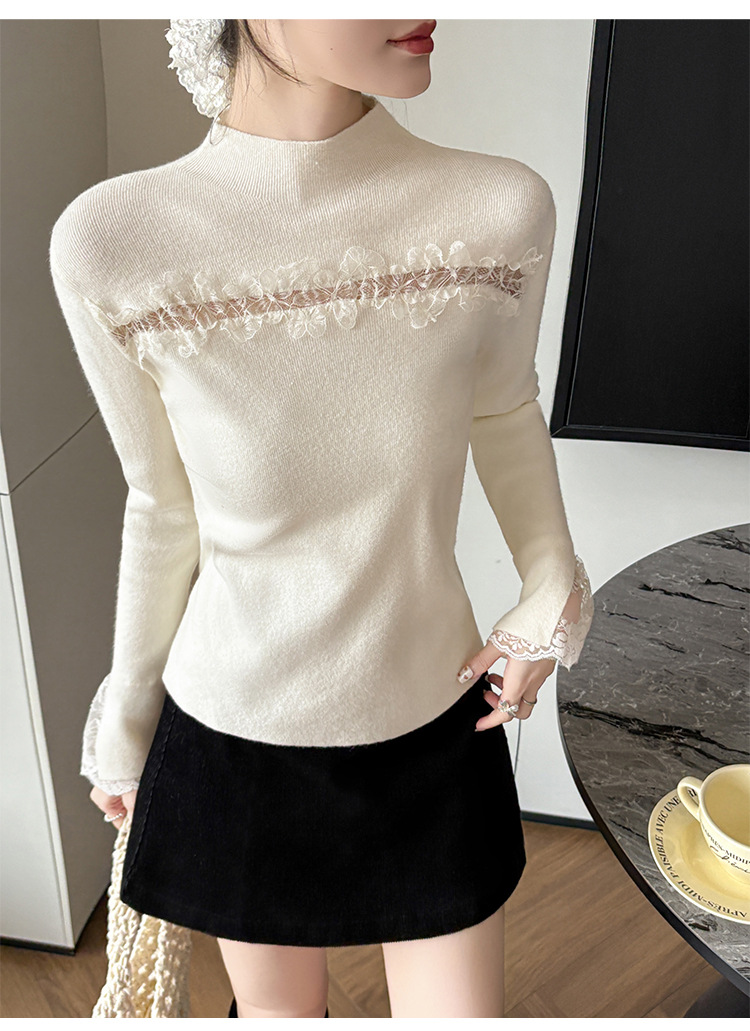 Lace Trim Halter Neck Knit Top - Hollow Out Long Sleeve