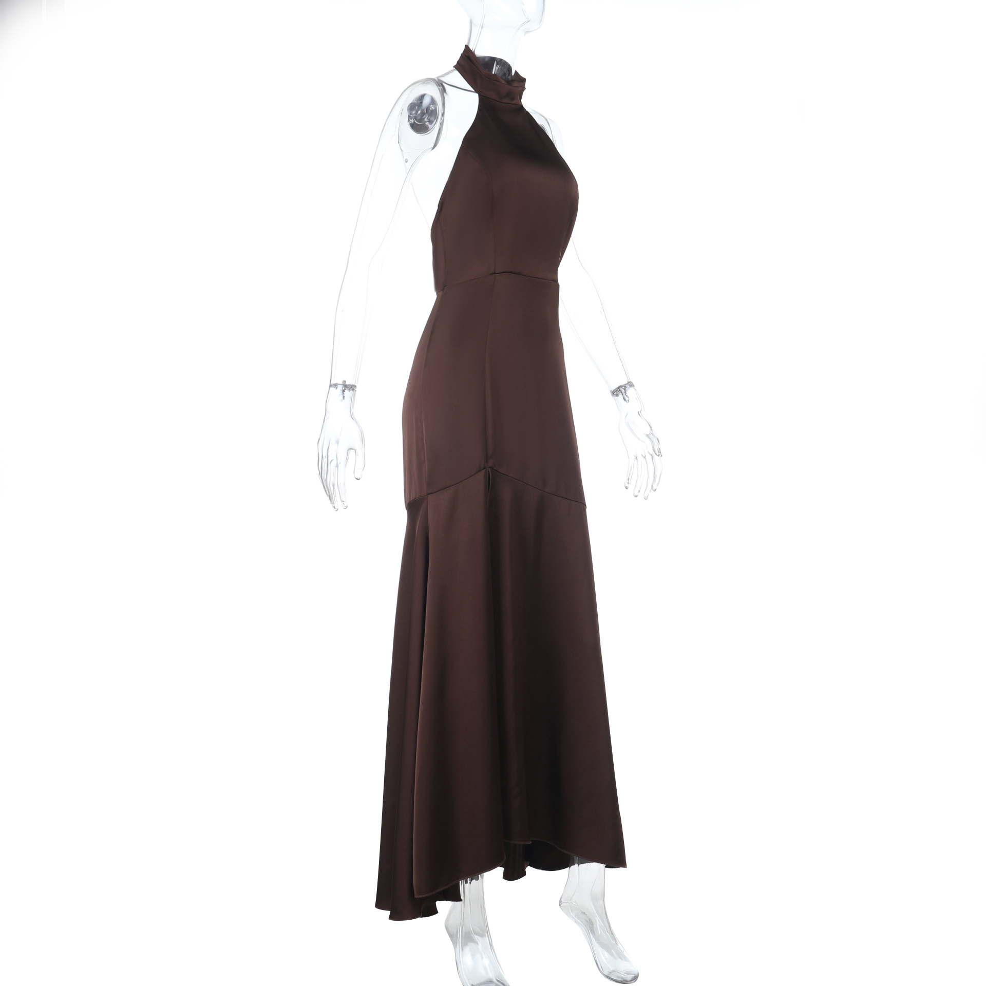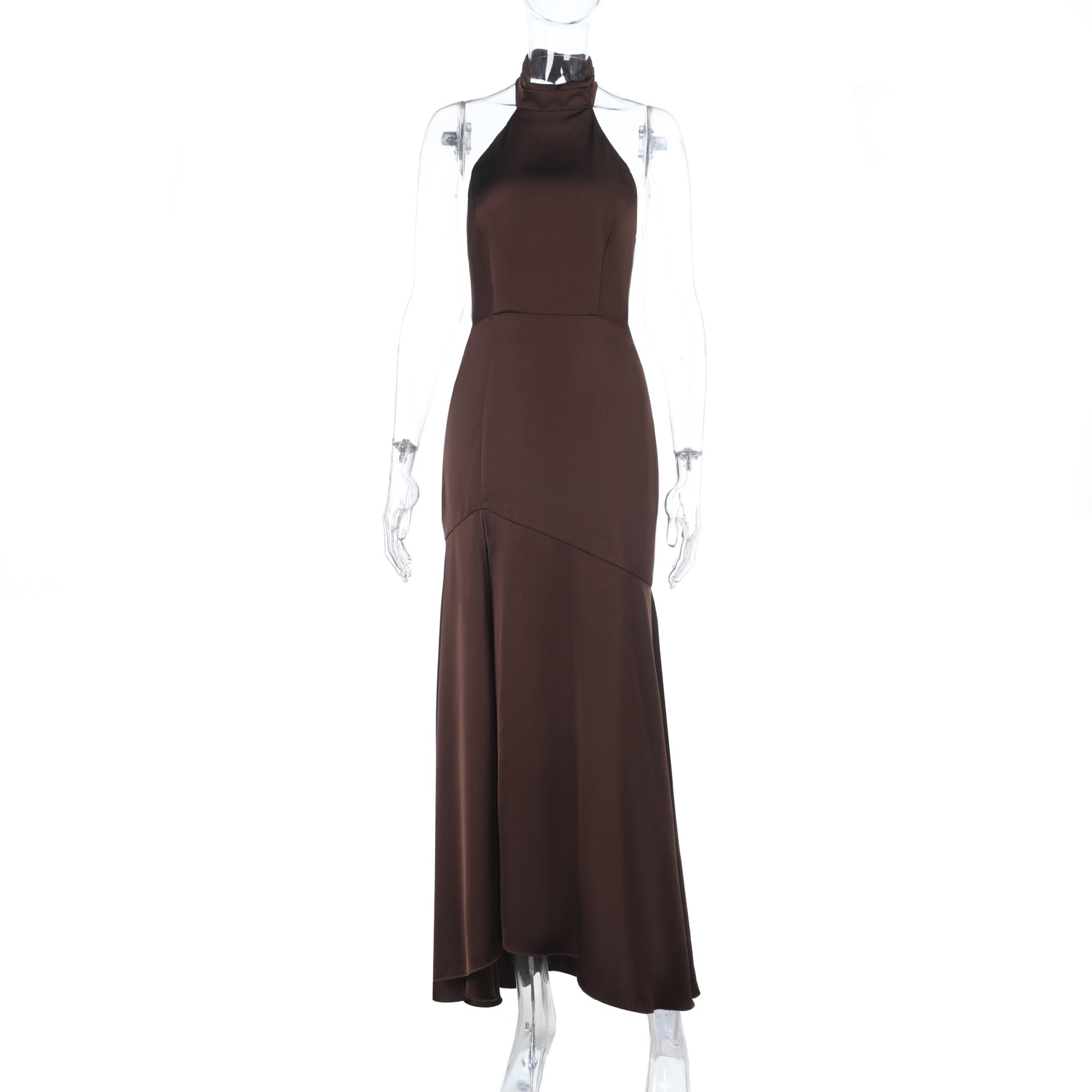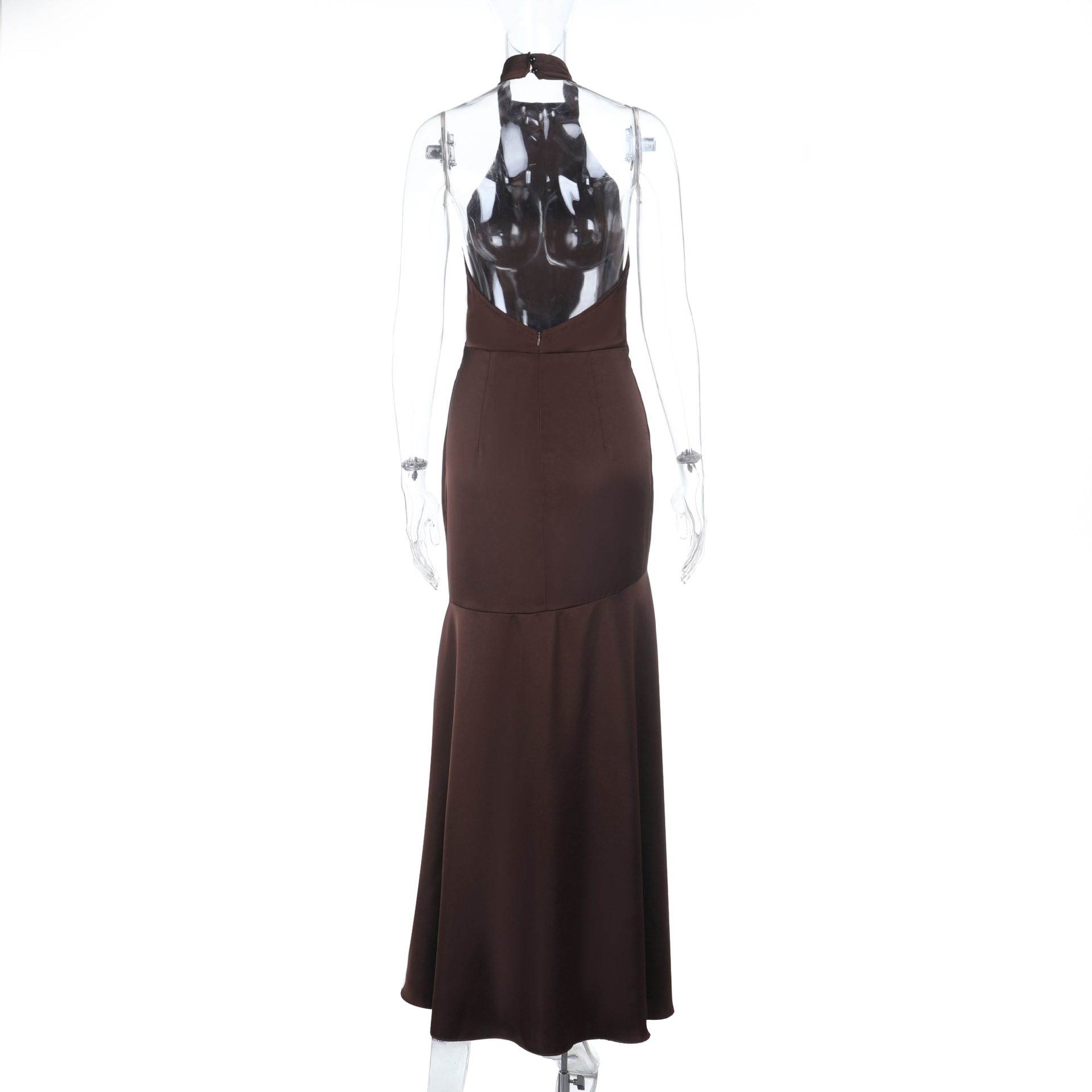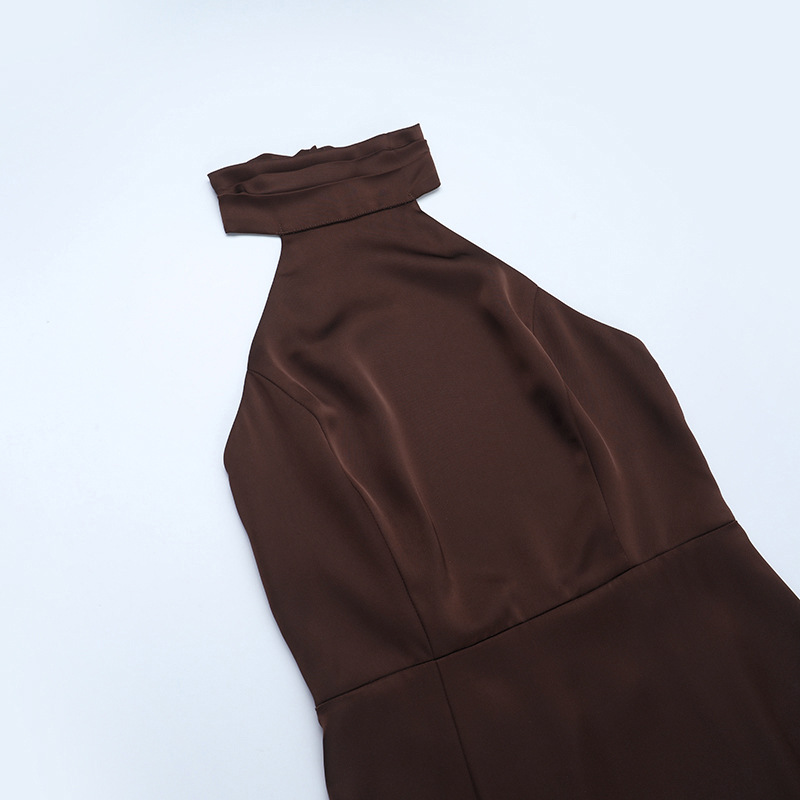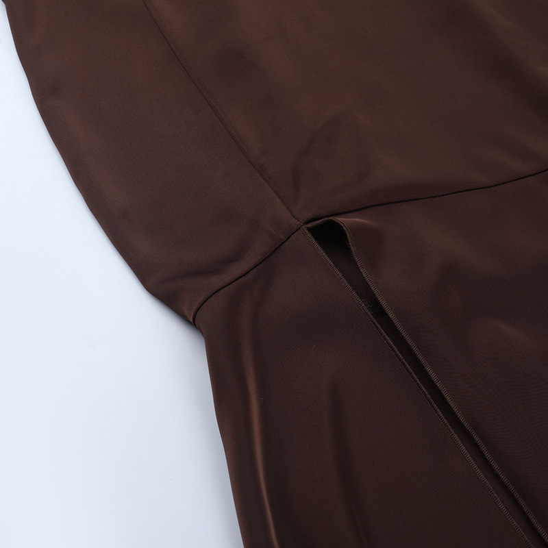 Satin Slit Solid Color Evening Gown - Brown One-Shoulder Buttocks Wrapped Long Skirt